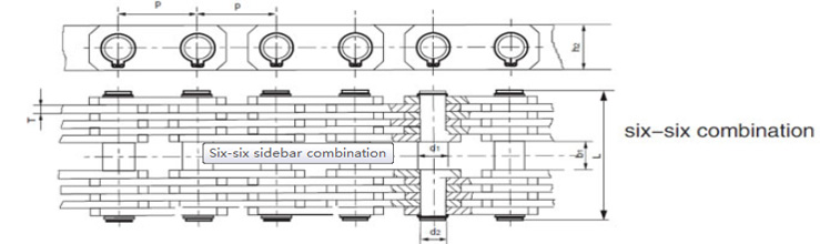 Chain no.Pitch P (mm)Inner width of inner link b1 (max.) (mm)Diameter of pin (max.) (mm)Length of pin L (max.) (mm)Height of sidebar h2 (max.) (mm)Thickness of sidebar T (mm)Combination of sidebars n*nAllowed working tension (KN)