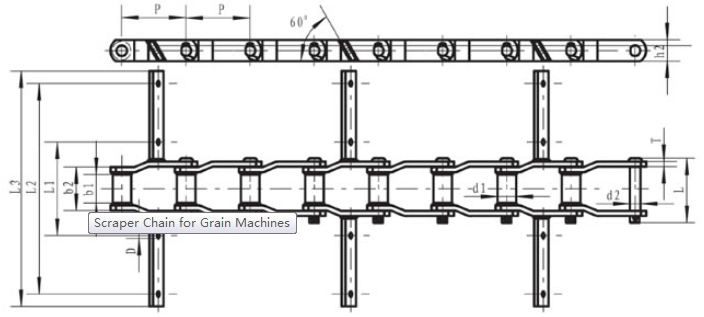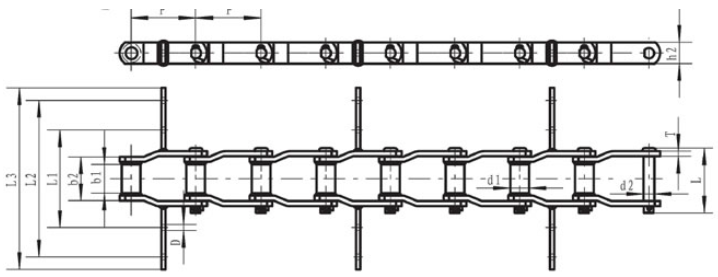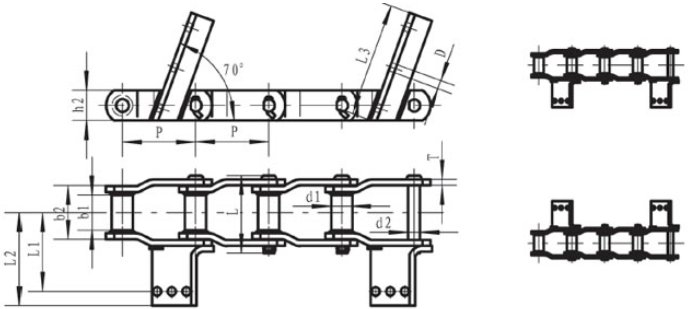 | Chain No. | Pitch P (mm) | Outer diameter of bushing d1 (mm) | Diameter of pin d2 (max) (mm) | Height of sidebar h2 (max) (mm) | Inner width between small ends b1 (mm) | Outer width between small ends b2 (mm) | Thickness of sidebar T (mm) | Dimension of scraper | Tensile strength Q (min) (KN) | |||