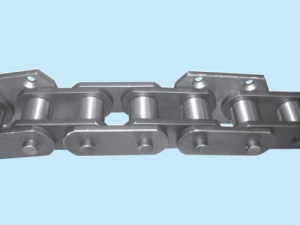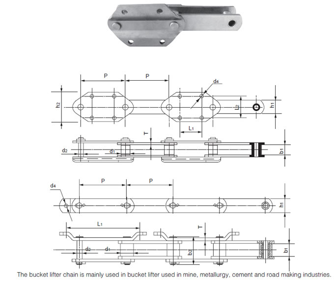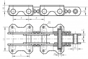 | Chain No. | Pitch P (mm) | Diameter of roller d1 (mm) | Diameter of pin d2 (mm) | Length of pin L (mm) | Inner width of inner link b1 (mm) | Thickness of sidebar T (mm) | Height of sidebar h2 (mm) | Height of attachment h2 (mm) | Tensile strength Q (min.)(KN) |