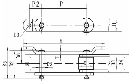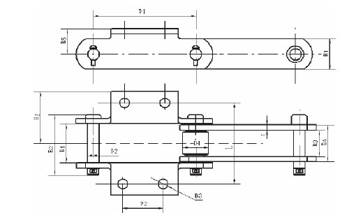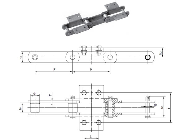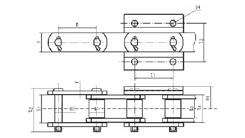 | Chain No. | Pitch P (mm) | Inner width of inner link b1 (mm) | Diameter of roller d1 (mm) | Diameter of pin d2 (mm) | Height of sidebar h2 (mm) | Thickness of sidebar T (mm) | Hole height of attached plate (mm) | Central distance of attached plate L1(mm) | Hole diameter of attached plate d4 (mm) | Tensile strength Q(KN) |