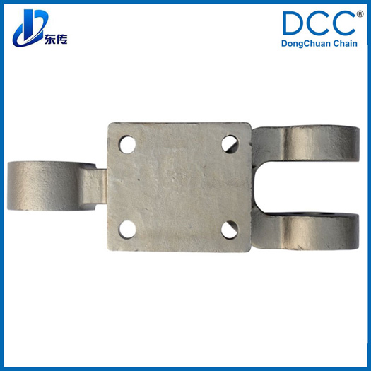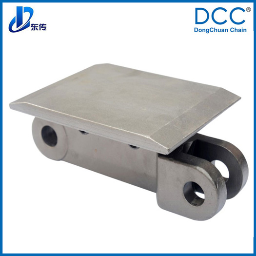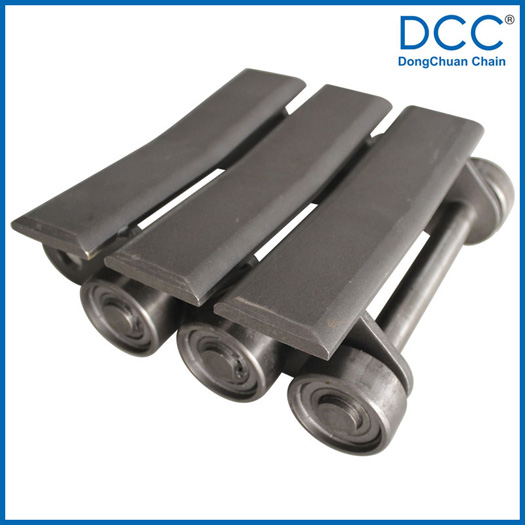 紙卷運(yùn)輸鏈主要輸送紙卷,鏈條為頂板和鏈條焊接的結(jié)構(gòu)。為了確保鏈條和頂板的焊接平直度,我們采用了多工位自動(dòng)焊接的加工設(shè)備,對(duì)多個(gè)焊點(diǎn)同時(shí)焊接,降低了局部焊接時(shí)會(huì)產(chǎn)生的變形。頂板也采用了冷拉成型的工藝,使得頂板表面有較好的光潔度和平整度。在套筒和銷(xiāo)軸間加裝了SF1軸套,在銷(xiāo)軸兩端使用了專(zhuān)用的弧形外圈軸承,提高了鏈條的使用周期。